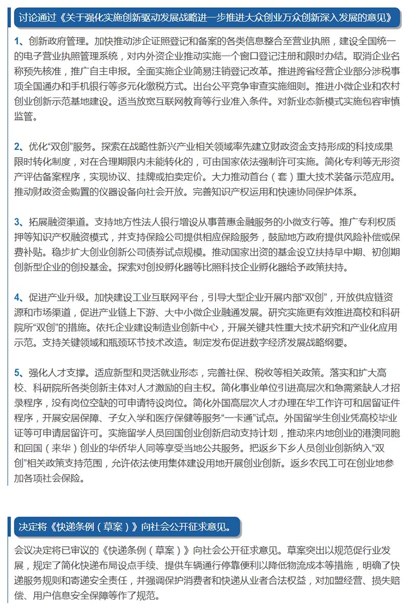 讨论通过《关于强化实施创新驱动发展战略进一步推进大众创业万众创新深入发展的意见》,决定将《快递条例(草案)》向社会公开征求意见。7月12日的国务院常务会定了这两件大事。会上,李克强总理作出了哪些部署?中国政府网(ID:zhengfu)为你梳理───